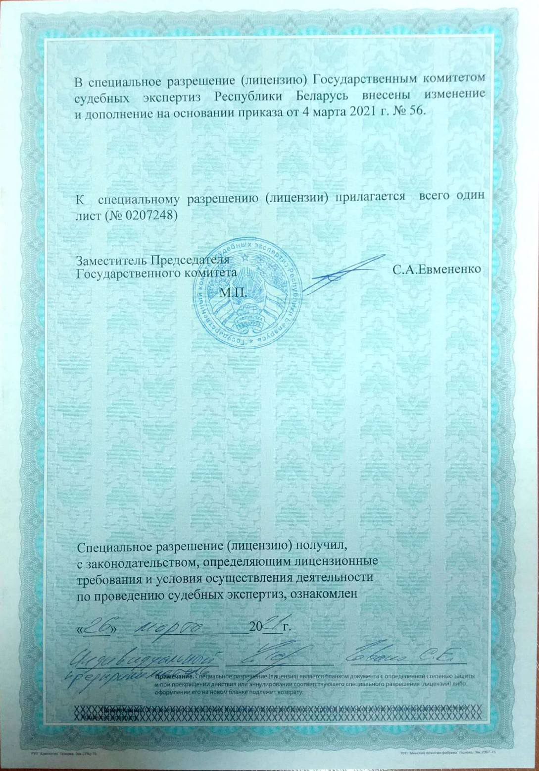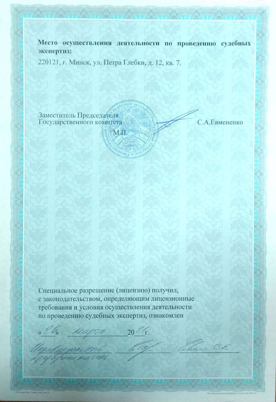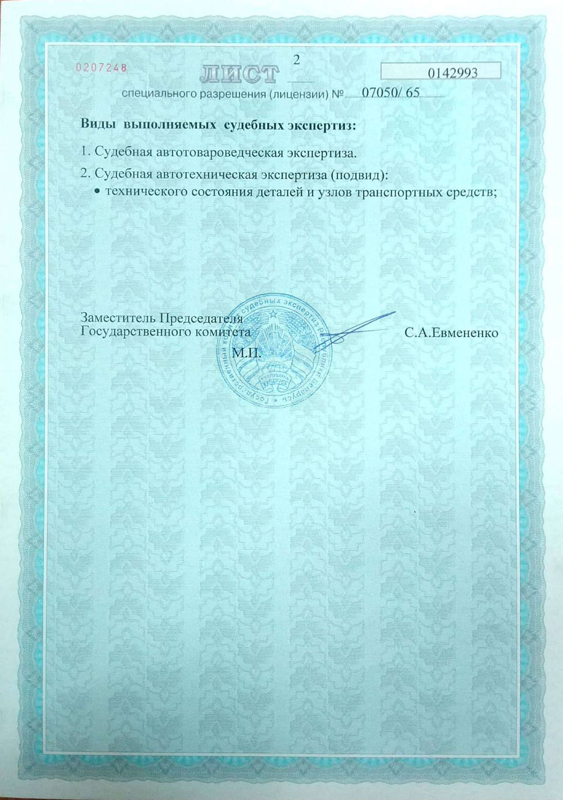 Специальная подготовка в области производства судебных автотехнических и автотовароведческих экспертиз по специальностям: «Автотовароведческая экспертиза», свидетельство о присвоении квалификации судебного эксперта №32 по виду: судебная автотовароведческая экспертиза, выданное Государственным комитетом судебных экспертиз Республики Беларусь, и «Судебно-автотехническая экспертиза. Исследование технического состояния и деталей транспортных средств», свидетельство о присвоении квалификации судебного эксперта №261 по виду: судебная автотехническая экспертиза (техническое состояние деталей и узлов транспортных средств), выданное Государственным комитетом судебных экспертиз Республики Беларусь.