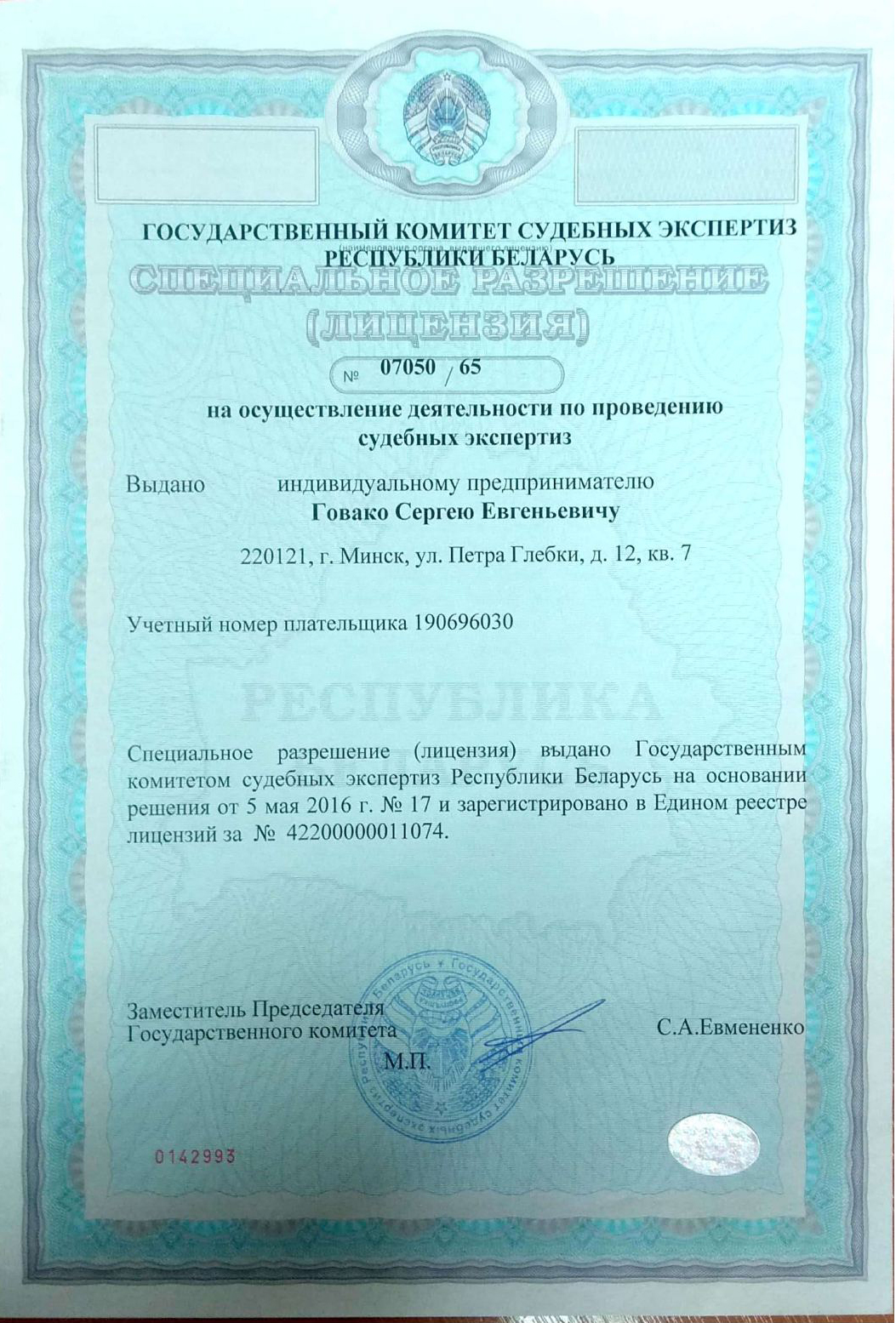 Судебную автотехническую и автотовароведческую экспертизы проводит индивидуальный предприниматель Говако Сергей Евгеньевич, действующий на основании свидетельства о государственной регистрации №190696030 (УНП, Минский горисполком) и специального разрешения (лицензии) №07050/65, зарегистрированного в едином реестре лицензий Республики Беларусь (https://лицензия.бел - расширенный поиск проводить по номеру УНП или лицензии).